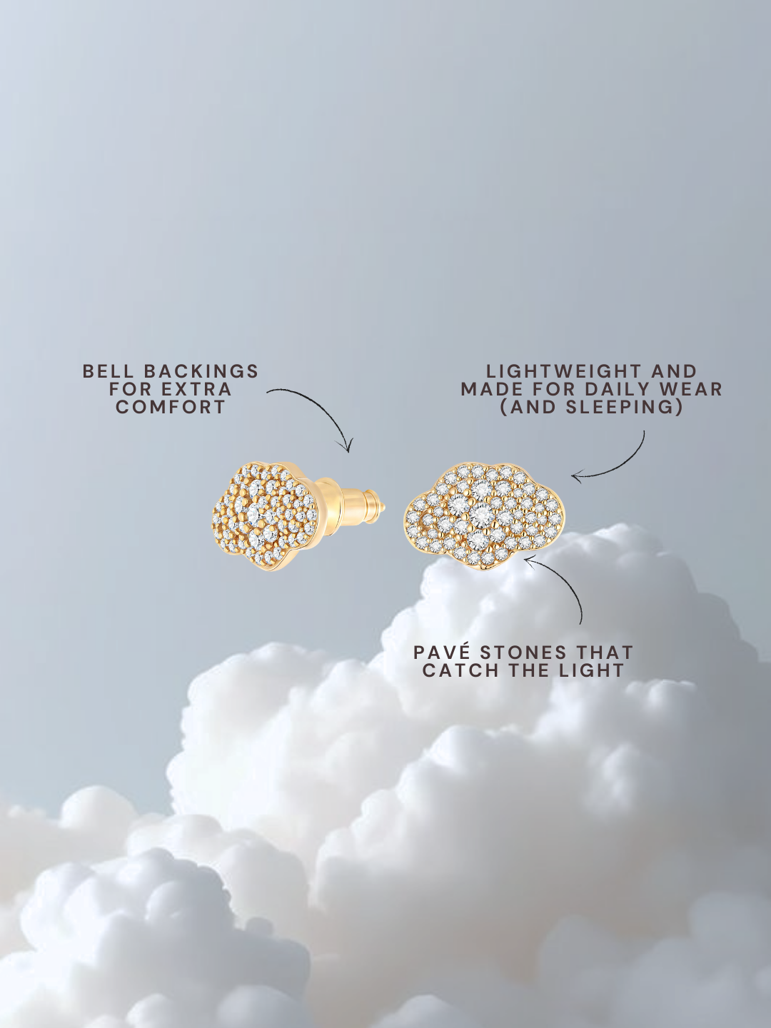 Your head should always be in the clouds. When we remember that God’s love is unconditional and his faithfulness is infinite, we begin to walk in Heaven. Delicate yet luminous, these petite studs symbolize divine covering and clarity. Their cloud-like silhouette adds a whisper of shine to every moment. They are lightweight, waterproof, and designed for everyday wear.