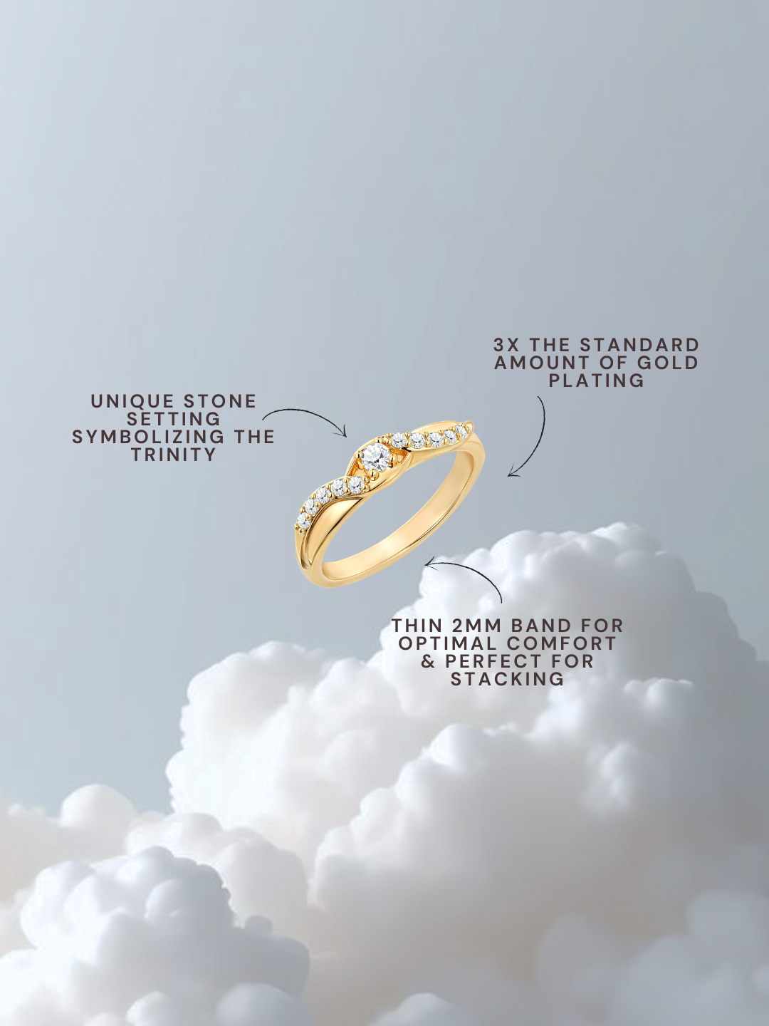 The two side stones support the center stone, just as the Son and the Holy Spirit uphold the Godhead in divine harmony. This ring is a symbol of the loving favor, love, and fellowship of the Trinity working together in your life. This ring is perfectly dainty and will stunningly stack with our Eternity Bands for a layered look that speaks to the fullness of God's presence.